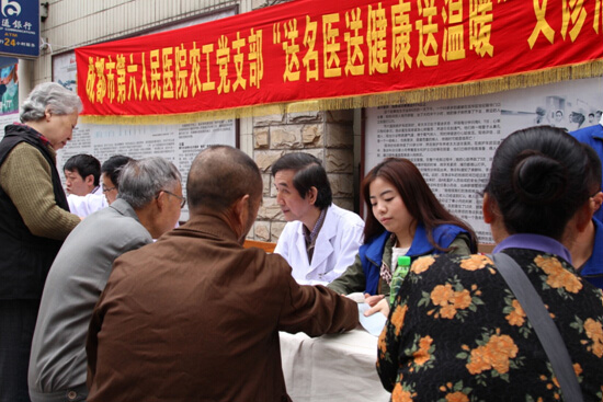 2015年4月28日,市六医院支部联合医院团委在成华区建设路社区开展“送名医、送健康、送温暖”大型义诊活动。