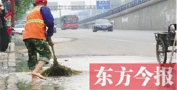 一大早,在建设路与西四环交叉口东北角,版主看到一位环卫工,挽起裤腿,光着脚站在马路上的积水中,用扫帚将积在低洼处的水,扫进路边的雨水井里。许多过路的行人看到后都表示“深受感动”。