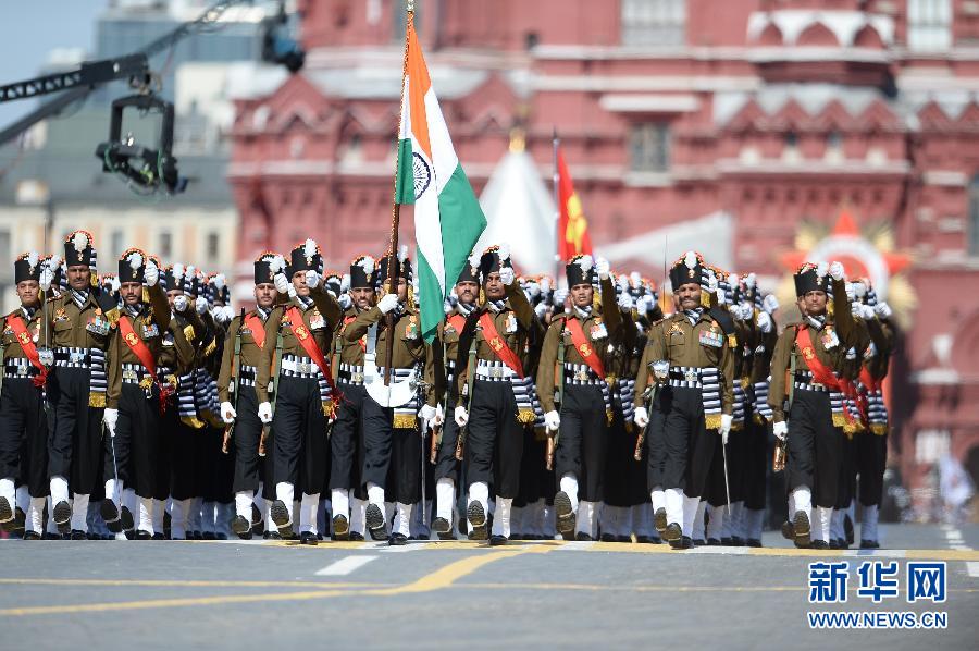5月9日,在俄罗斯首都莫斯科红场,印度陆军掷弹兵方阵行进在阅兵式上。 俄罗斯9日在莫斯科举行盛大庆典,隆重纪念卫国战争胜利70周年。新华社记者贾宇辰摄
