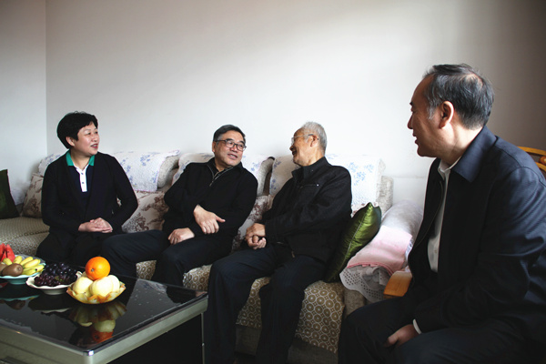 5月11日至12日,民进中央副主席朱永新赴学习实践活动联系点赤峰市调研座谈。图为朱永新一行看望85岁的赤峰民进第一任支部主任王之璞。