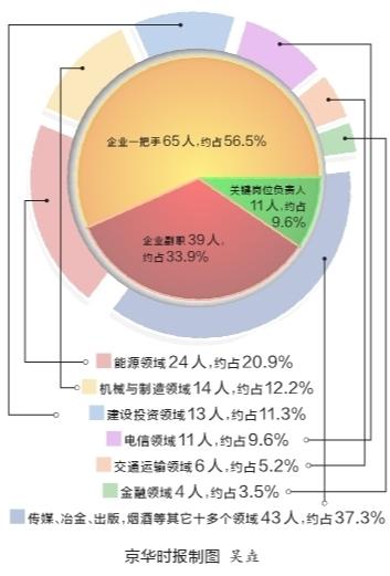 董事长、总经理等一把手毫无意外地成为国企腐败分子中的“大多数”。115名“落马”国企高管中,董事长、总经理等企业一把手共有65人,如广东电网公司原总经理吴周春、上海市电力公司原总经理冯军等,占比约56.5%。