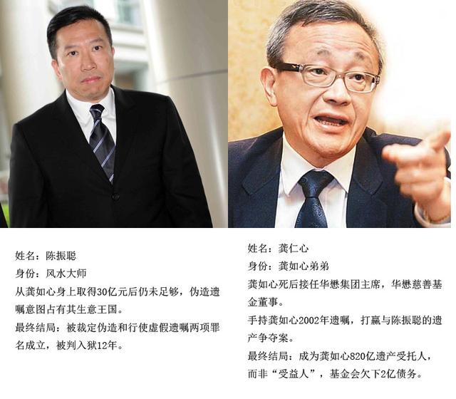 龚如心遗产争夺案在香港高等法院开审。按法律,遗嘱以最后订立者为准,因此陈振聪所持遗嘱的真伪,及他与龚如心之间的关系成为此案关键。香港高等法院裁定,商人陈振聪在已故华懋集团主席龚如心的遗产认证案中败诉,有关遗产将拨归华懋慈善基金。 香港高等法院昨日公布的判词长达300余页,指龚如心与商人陈振聪的关系仅属客户与“风水师”,华懋所持2002年的遗嘱是最后及有效的遗嘱。陈振聪持有的2006年遗嘱中龚如心的签名是伪冒。