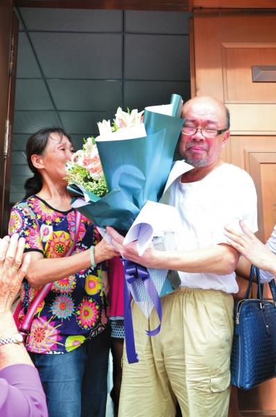 接过家属送上的鲜花,黄政耀流下眼泪。家属供图