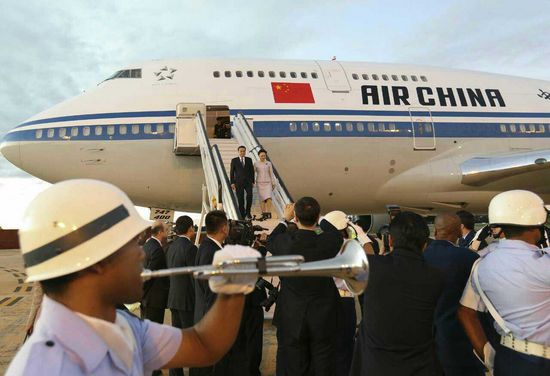 巴方礼兵分列红地毯两侧,吹起嘹亮的军号向远道而来的贵宾致敬。李克强夫妇同前来迎接的巴西政府高级官员、巴西利亚空军基地司令等亲切握手。中国驻巴西大使李金章也前来迎接。