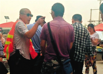 地铁天通苑北站外的广场上,一名套着“Police”(警察)字样背心的人要求摆摊的记者离开,但没驱赶其他摊贩。