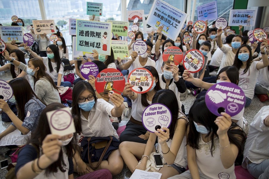 5月19日,香港国泰空中服务员工会发动马拉松式静坐,现场参与示威的空乘。