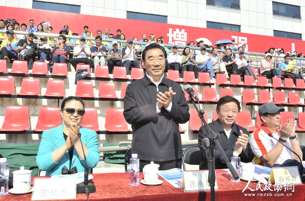 5月20日上午,全国政协机关第九届职工运动会在北京月坛体育场开幕。图为十二届全国政协副主席兼秘书长、机关党组书记张庆黎宣布运动会开幕。人民政协网记者 姜贵东摄