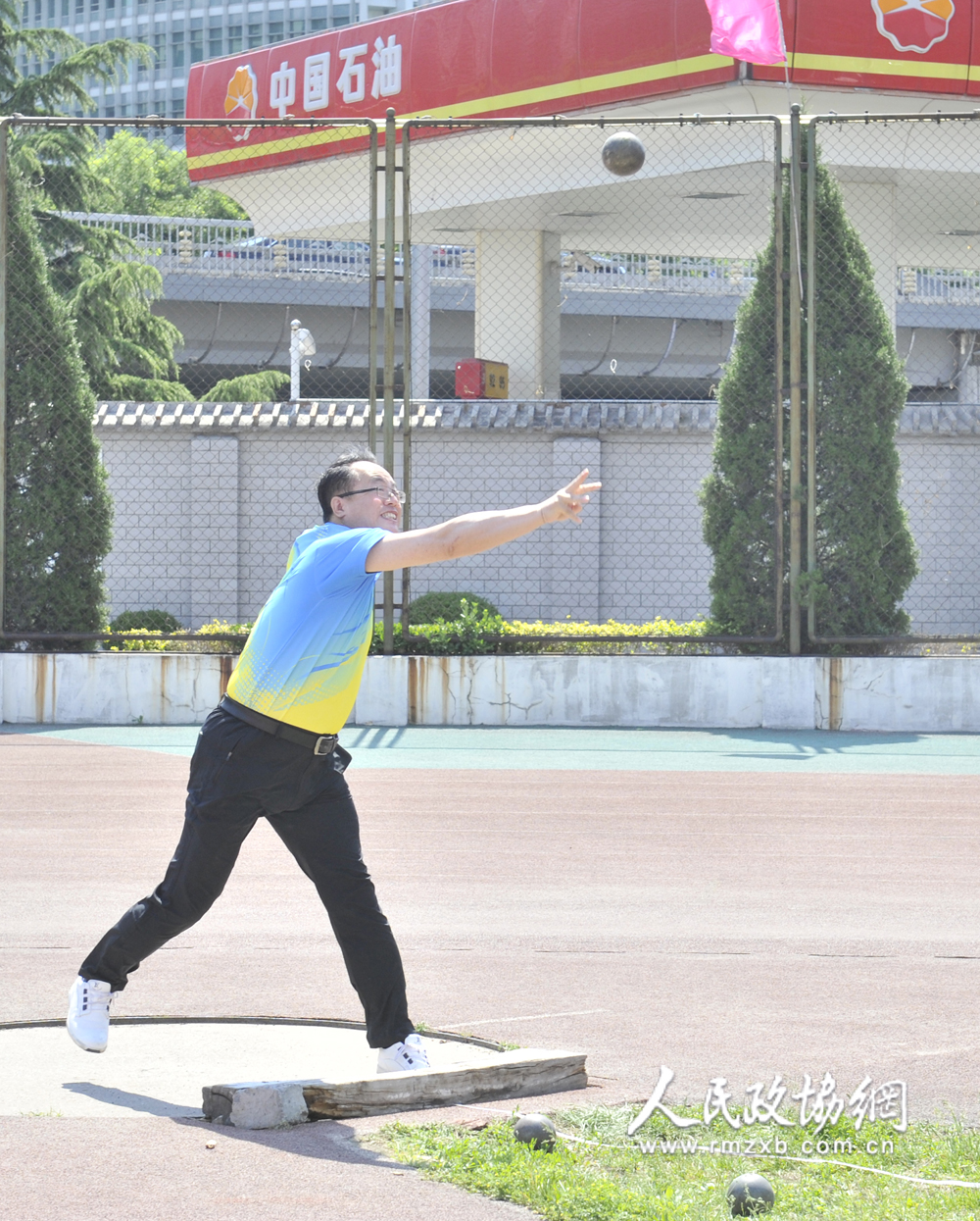 5月20日上午,全国政协机关第九届职工运动会在北京月坛体育场开幕。图为男子铅球比赛。人民政协网记者 姜贵东摄