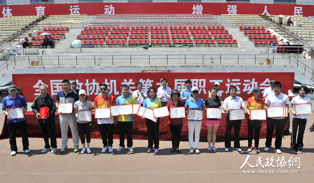 5月20日上午,全国政协机关第九届职工运动会在北京月坛体育场开幕。图为颁奖仪式。人民政协网记者 姜贵东摄