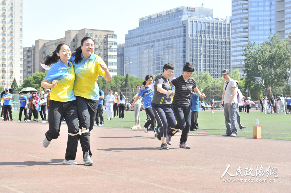 5月20日上午,全国政协机关第九届职工运动会在北京月坛体育场开幕。图为“两人三足”比赛进行中。人民政协网记者 姜贵东摄
