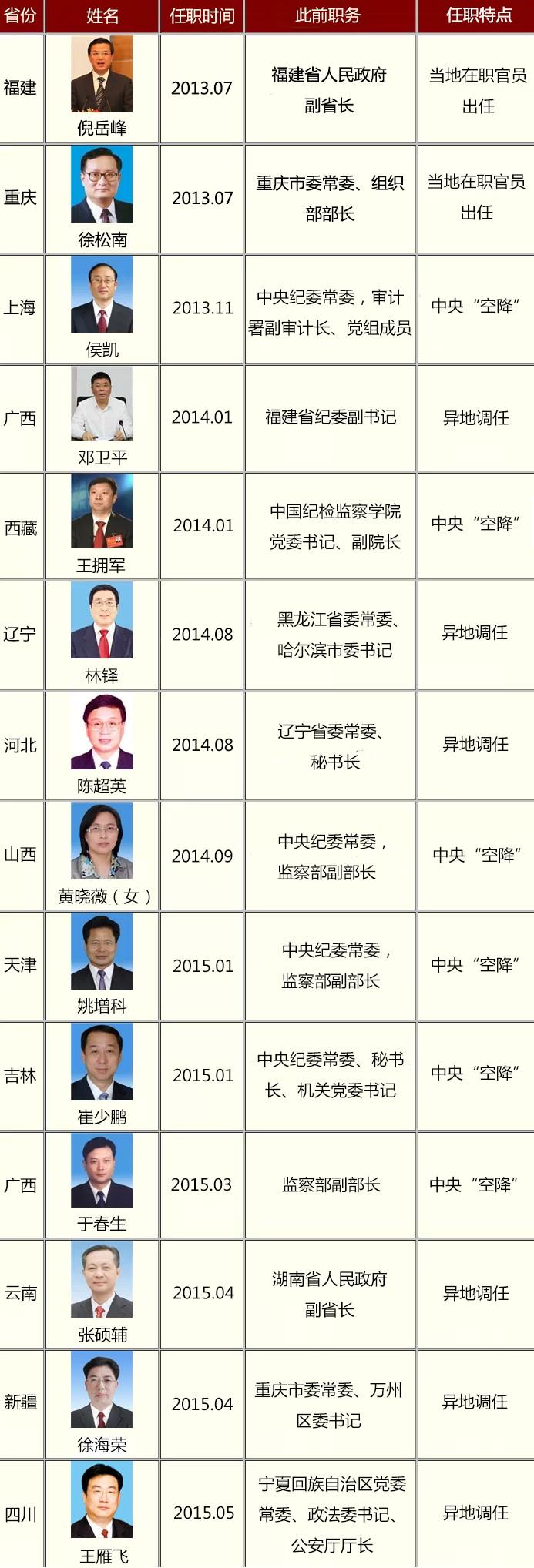 十八大以来 13个省份调整省级纪委书记情况名单