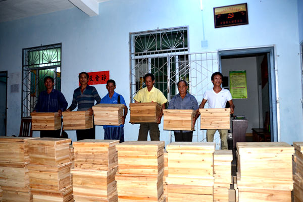 “每户人家十箱,你们要好好照顾啊。”工作人员顾不上喝上一口村民们捧上的青椰子水,便忙着指挥大家从车上小心翼翼地把蜂箱搬下来。