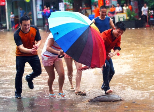 2015年5月20日,广东东莞降暴雨,街道一片汪洋,积水到行人膝盖,河中的鱼也因水位上涨冲入路面,市民街头抓鱼。