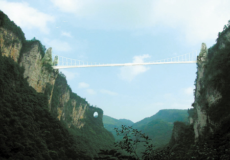2015年5月21日,号称世界最长、最高的全透明玻璃桥———张家界大峡谷玻璃桥将于7月向游客开放。玻璃桥总长430米、宽6米,桥面距谷底约300米,可站800人。整个工程无钢筋混凝土桥墩,同时肩负蹦极、溜索、舞台等多种功能。