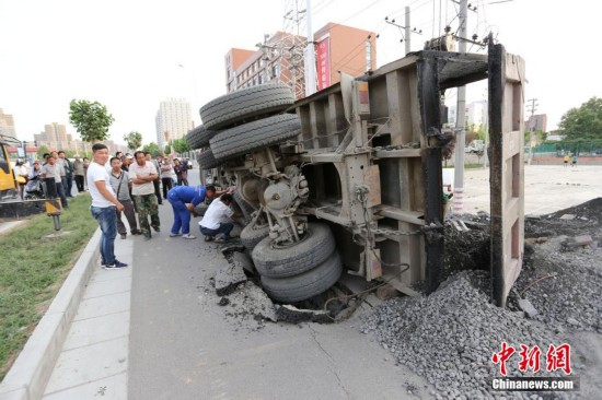 图为一辆满载建筑材料的渣土车途径此处路面突然塌陷造成车辆侧翻。 杨正华 摄