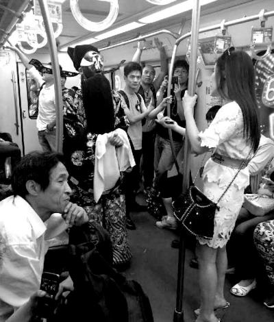 目击者提供的照片显示,地铁车厢内站着一位着包公戏服、化着黑白色脸谱的乘客,和一穿白衣的女子面对面在说话,车厢内多名乘客围观拍照。