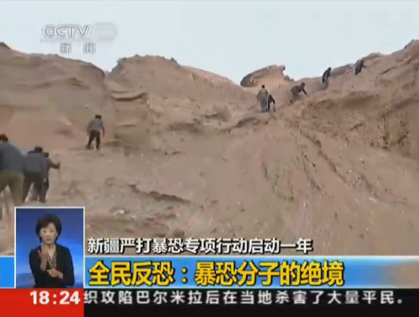 图为央视新闻截屏画面,新疆警察和民众一同搜山抓暴恐分子。