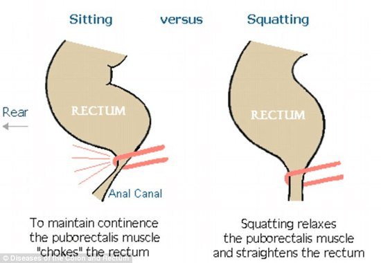 恩德斯解释:由于人的肠道像弯弯曲曲的软管,如果我们采取坐姿,在结肠的末端就会挤压出一个曲线,以致需要费力才能将便便排出。而如果我们采取蹲便的方式,例如在马桶前放个小板凳并把双脚踩在上面,那么肠道的角度就会变得平顺,使便便能够在较小的压力下轻松排出?! 《鞯滤菇馐停河捎谌说某Φ老裢渫淝娜砉埽绻颐遣扇∽?,在结肠的末端就会挤压出一个曲线,以致需要费力才能将便便排出。而如果我们采取蹲便的方式,例如在马桶前放个小板凳并把双脚踩在上面,那么肠道的角度就会变得平顺,使便便能够在较小的压力下轻松排出。