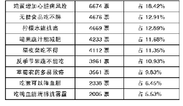 此次调查时间为5月7日~5月11日,通过网站、微信、手机报等渠道进行,投票总数超过了36229票。调查共设9道常见的食品营养问题,其中,鸡蛋增加心脏病危险、无糖食品吃不胖、柠檬水抗癌、喝果蔬汁能减肥、隔夜菜吃不得得票率位列前五。