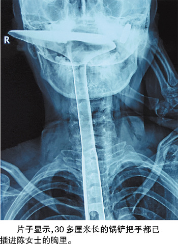 陈女士被紧急送到医院,当晚又被转送到康华医院。在医院拍的片子显示,30多厘米长的锅铲把手都已插进陈女士的胸里,情况非常危急。记者从医生手机里保存的照片上看到,当时陈女士的嘴巴张着,只有锅铲的前端还露在嘴巴外面,她的左手扶着锅铲,锅铲上和手上都是血。