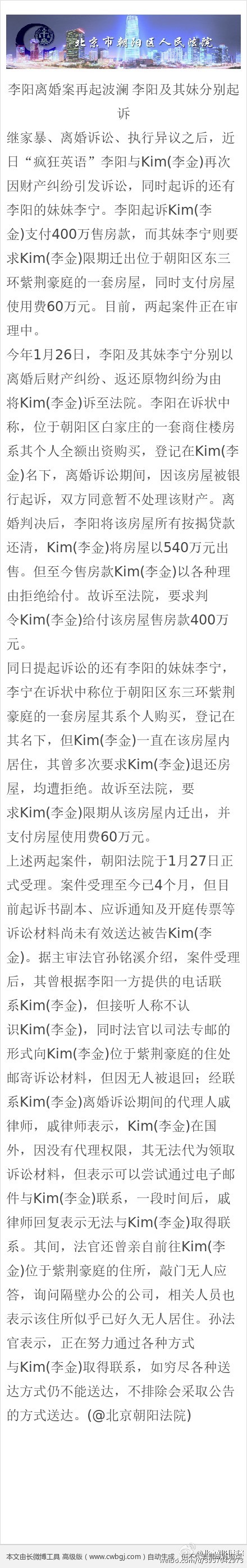中新网5月28日电 据北京市朝阳区人民法院官方微博消息,继家暴、离婚诉讼之后,“疯狂英语”李阳与其前妻Kim(李金)再度因财产纠纷引发诉讼,同时起诉的还有李阳之妹李宁。