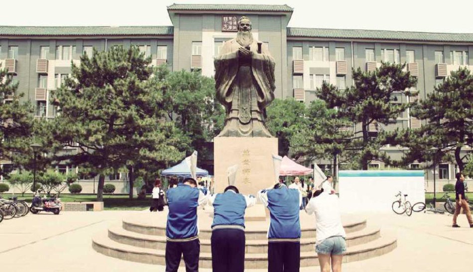 据网友爆料,日前,北京四名高三生在一所学校的孔子像前祭拜,并在孔子像前焚烧预测卷。图片来自微博