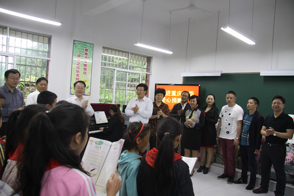 青年镇民族小学所在的青年镇更古村是少数民族散杂居住区,学校少数民族学生和留守学生较多,是民进重庆市委会“进盛合作”社会服务项目下的一个帮扶重点。上午,陈贵云带领大家冒雨来到学校,走进教室,看望老师和学生们。陈贵云翻看课本,与老师和孩子们亲切交谈,详细了解学校教育教学和学生们的学习生活情况以及存在困难,鼓励孩子们认真学习,健康成长?;疃埃形崃私獾窖P枰⑿T巴际槭?,缺少书籍和教学器材。此次市委会带来了由渝中民进企业家会员们爱心捐赠的一架钢琴、1000余册图书、一批体育器材和衣物,作为六一儿童节的礼物。学生们非常兴奋,在所捐赠钢琴的伴奏下演唱了歌曲《春天在哪里》来感谢民进叔叔阿姨们的关爱,大家也一起击掌合唱,欢歌笑语一片。
