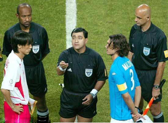 莫雷诺(厄瓜多尔)很难评判这位掏牌爱闭着眼的小个子是不是历史上最黑的裁判,但要说其影响力之大、典范意义之深刻、认知度之高只怕达到了前人所望尘莫及的高度。2002年世界杯他的风头之劲一时无两,让所有人望尘莫及。“莫大先生”随手可以发明点球,随手发送两色牌子,“宁可错杀一千,不可放过一个”,愣是把托马西成功的反越位单刀球定性为越位。眼袋颇深的他视力似乎也不大好,这边对李天秀恶意踩踏马尔蒂尼视而不见,回头又能“火眼金睛”看破托蒂的“假摔”,不懂人情世故地奉上红牌……一战成名典型莫过于此,有趣的是,世界杯后压力颇大的他干脆辞去裁判职务,利用名人优势圈钱,甚至不介意去“仇家”意大利那儿抛头露面出席各种电视节目,人人喊打中乐滋滋地做他的过街老鼠。