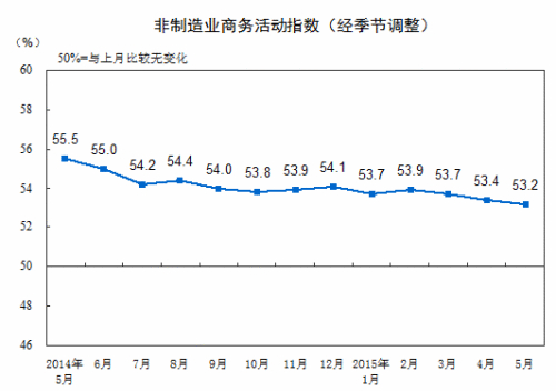 数据显示,2015年5月份,中国非制造业商务活动指数为53.2%,比上月小幅回落0.2个百分点,高于临界点3.2个百分点,表明我国非制造业继续保持平稳增长状态,但增速略有放缓。