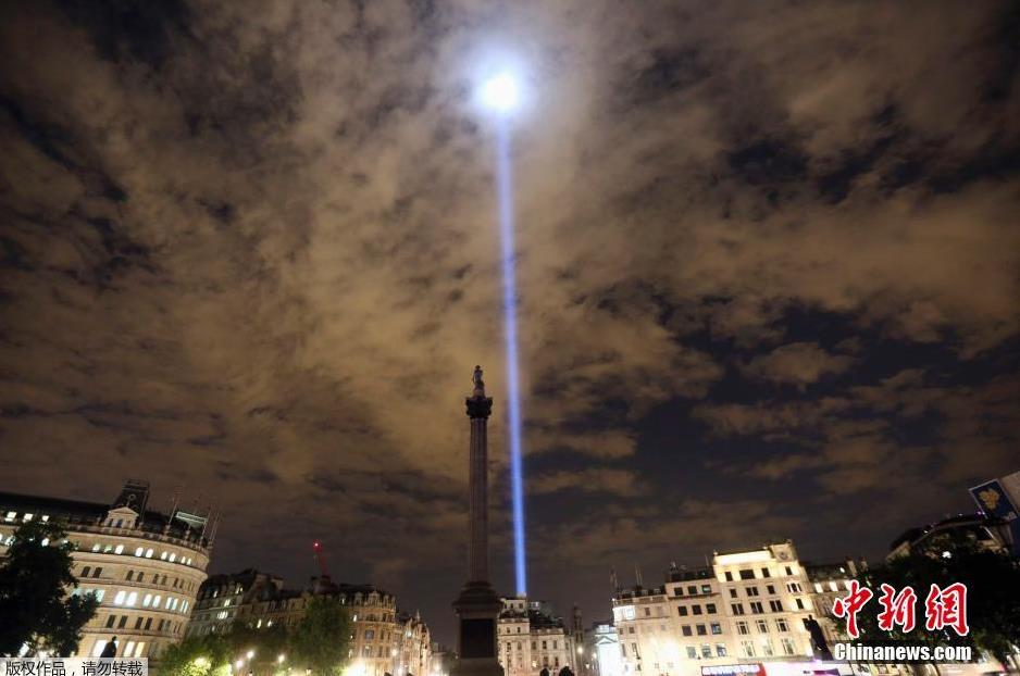 当地时间8月4日,伦敦特拉法加广场的夜空一道光柱划破天际,这是为了纪念第一次世界大战百年的一个特殊的活动。作为纪念活动的一部分,英国各地在8月4日当晚关灯一小时来悼念在一战中死去的同胞,灯光点亮伦敦夜空的活动将持续七天。