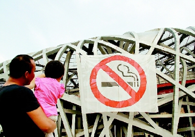 北京正式施行“最严禁烟令”,在国家体育场“鸟巢”悬挂巨幅禁烟标志。 新华社发