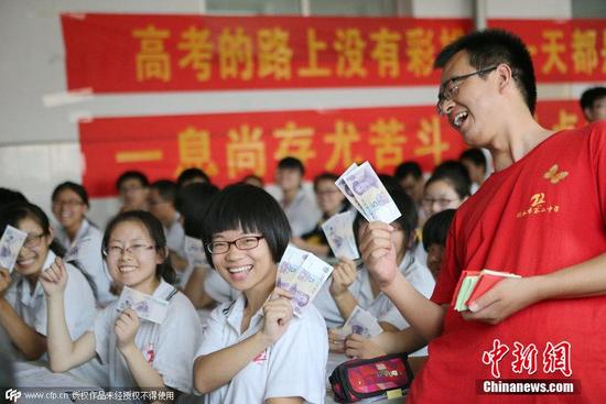 6月3日,河北衡水二中为每位备战高考的高三学生发放了两张5元崭新连号人民币留作纪念。十元钱代表“十全十美”,连号则代表“顺顺利利”,这是该校为多年来考前减压活动之一,也是送给考生们的真诚祝愿。收到学校的“福利”和祝福,考生们开心不已。
