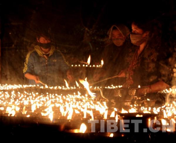 萨嘎达瓦节首日清晨,千佛崖燃灯房内点燃了上万盏酥油灯。摄影:张丽娜
