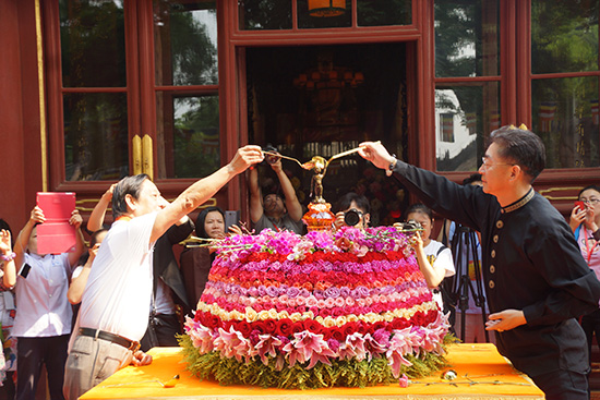 5月25日,在北京广济寺举办的庆祝佛诞节浴佛法会上,信徒用勺舀起香汤净水为释迦太子像淋浴。