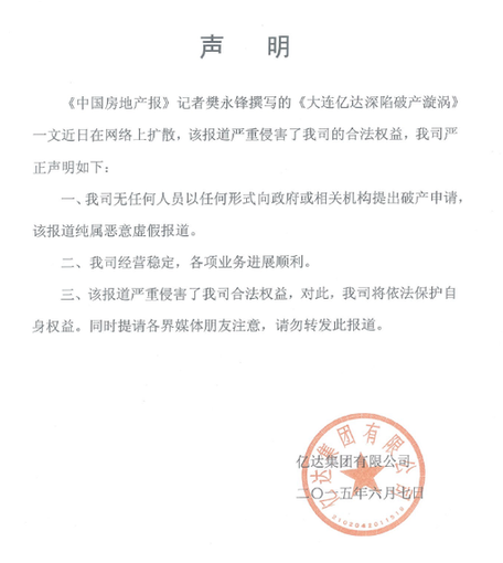 声明指出:《中国房地产报》记者樊永锋撰写的《大连亿达深陷破产漩涡》一文近日在网络上扩散,该报道严重侵害了我司的合法权益,我司严正声明如下:
