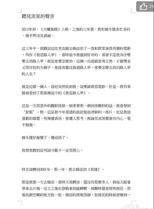 2015年5月,电影《我是路人甲》在香港举行了一场小型试映会?;疃崾?,梁朝伟欣然写了一篇观后感,然后发给了尔冬升导演。梁朝伟所写影评标题为《听见流星的声音》。文中对尔冬升新片《我是路人甲》颇多赞美之词,并回顾了自己的演艺之路,文辞朴素却精致。众网友纷纷点赞梁朝伟的文笔,更有网友表示这是梁朝伟的高考满分作文。姚晨也转发影评全文,并表示:“没想到,梁朝伟先生的戏好看,文章也写得这么动人!其中的许多话,带我回到做演员的本初:唯有耐得住寂寞,方得始终。”