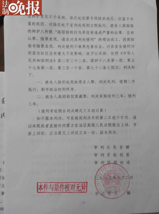 今年6月2日,内蒙古通辽市中级法院对此案下达判决,依法以“故意杀人罪”认定徐庆屹的行凶行为为“直接故意”,判决徐庆屹死刑,缓期执行。与其关系密切的青年女子高某因窝藏罪被法院判决有期徒刑三年,缓期三年执行。