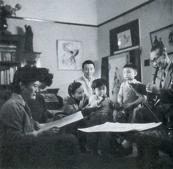 关良和儿女孙辈共享天伦(右边拉琴者为关良)。