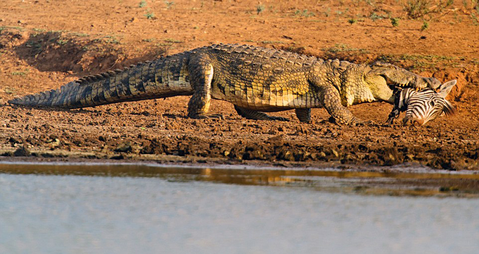 鳄鱼嘴里叼着死去斑马的头,正穿过克鲁格国家公园。(网页截图)