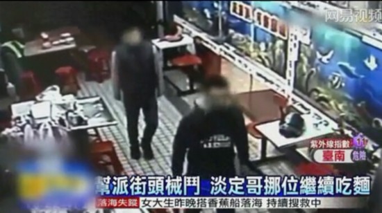 警方为侦办案件调阅附近监视器画面却发现,在意外发生当时,竟然有一名身穿蓝衣的男子淡定地坐在3米外的路边摊吃面,就算有帮派分子持刀在他身边与另一派成员对呛,他也只是移了一下椅子继续低头吃面,看着帮派斗殴10多分钟后才起身离去,态度冷静地让警方一度以为男子就是“幕后黑手”。