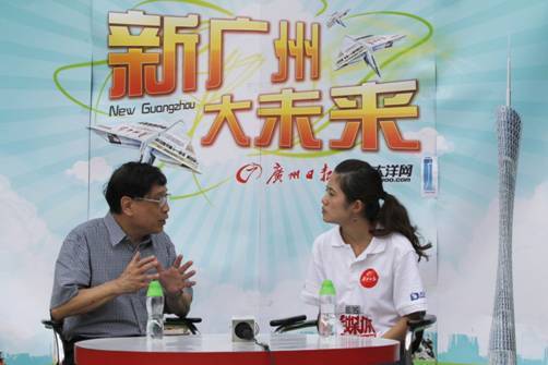 2011年6月15日,广州日报滚动新闻部成立四周年,以海陆空全方位全天多媒体的形式直播广州。图为《今日靓汤》栏目主持人佘自强接受滚动部记者的采访。