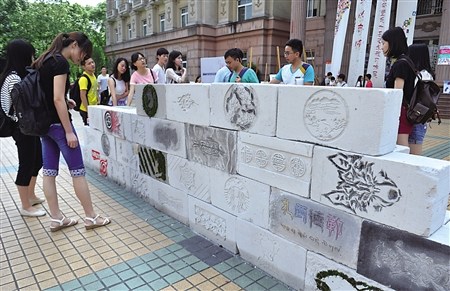 “《构成》课里需要讲到各种石材的纹理、雕刻的技术等。这些课,学生听着费力,教着也吃力,我干脆让学生在实践中去摸索材质的纹理、密度,然后进行雕刻。”负责该课程的讲师代璐告诉记者,于是,这学期期末,他们就以每块12元的价格运来了一种密度较低、但又比较好雕刻的建筑砖体——轻体砖,让学生们自由发挥,在一个月内雕刻出“汉砖”,花纹任选,但必须亲力亲为,且富有时代感。100多块“汉砖”如期完成,几乎都能以假乱真。如今,这些“汉砖”已放在了学校33教学楼的大门口,立成两面墙,供学生和市民参观。