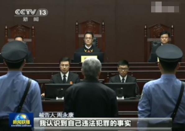 图为央视播出的周永康受审画面。