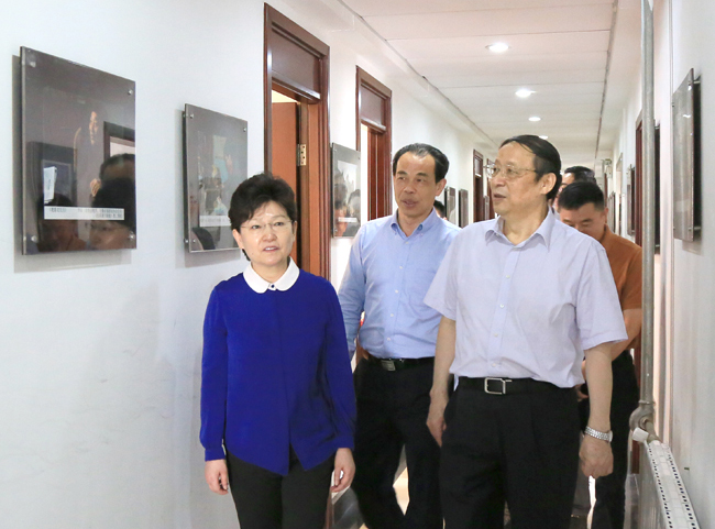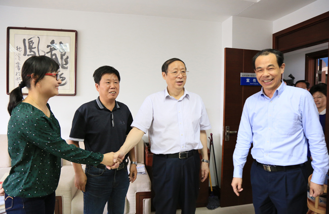 在中共安徽省委常委、统战部部长沈素琍的陪同下,王学军走进每一间办公室,与省政协副主席、民革安徽省委会主委夏涛,民革安徽省委会副主委兼秘书长吴延利及机关干部一一握手,了解机关人员情况、工作情况,视察办公环境。