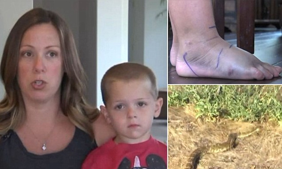 据报道,这位名叫贾克林(Jaclyn Caramazza)的孕妈家住在美国加利福尼亚州。事发当天,她的宝贝儿子文尼正在自家附近走动,结果不小心踩到一条小响尾蛇并被其袭击。贾克林发现后,让儿子脱下鞋袜,结果看到孩子的脚上有两道细小的咬痕。