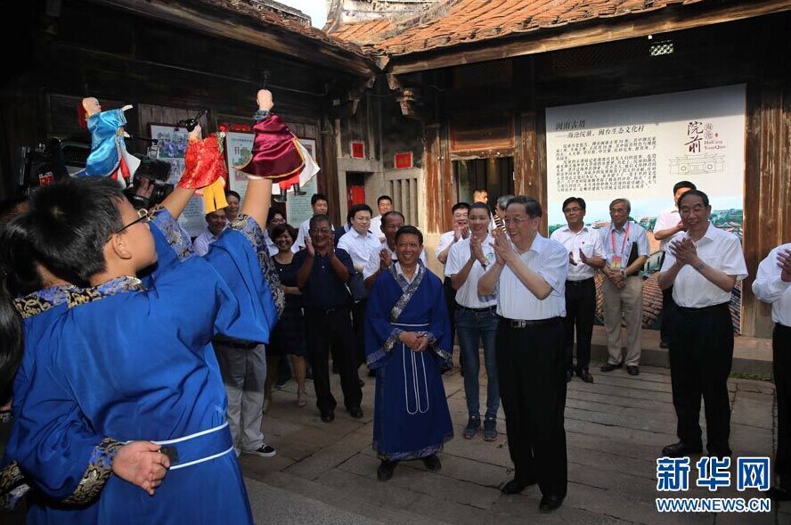 6月13日,中共中央政治局常委、全国政协主席俞正声来到厦门市海沧区青礁村院前社出席两岸“同名村、心连心”交流活动,并与部分前来参加第七届海峡论坛的乡亲座谈。这是俞正声在闽南古厝大夫第看望上国学课的“两岸阳光故事家族”师生,观看学生的传统文化表演。