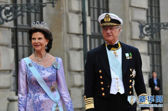 6月13日,在位于瑞典首都斯德哥尔摩市中心的瑞典王宫,瑞典国王卡尔十六世·古斯塔夫和西尔维娅王后出席菲利普王子的婚礼庆典。当日,瑞典王子卡尔·菲利普与索菲娅·赫尔奎斯特在斯德哥尔摩老城的王室教堂完婚。 新华社发(罗布·顺巴姆摄)