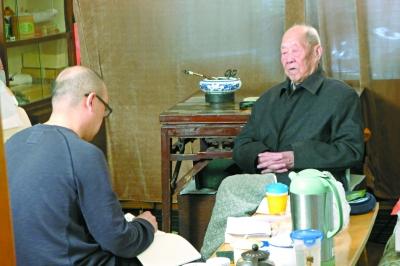 “太原会战”摄制组采访抗战老兵周锡奎。