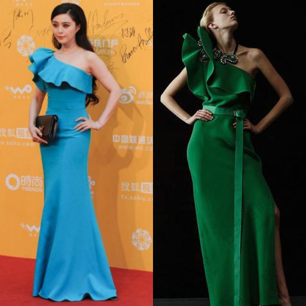 范冰冰在出席北京电影节红毯时身穿一袭蓝色荷叶边单肩礼服亮相,当时包括著名红毯点评网站RCFA都认为这条礼服为Lanvin 2014早春系列,因为好莱坞女星Roony Mara曾穿过白色版本。但之后造型师张帅却在自己微博表示这条礼服为“他为范冰冰设计”,最后RCFA也将之前发布的品牌名改为了ZHANG SHUAI。这颇为戏剧化的剧情实在尴尬——冰冰早已穿惯了各种高级定制量身订做礼服,这又是何必呢?