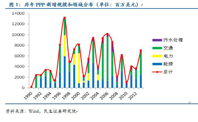 PPP模式具有较大的发展潜力。一方面,2013年中国PPP项目的累计总投资为1278亿美元,和同类型新兴市场比有较大的差距。另一方面,2013年新增的PPP投资额仅为7亿美元,而2013年城投债的发行量则高达9512亿元,若PPP模式成功替代城投主导的融资模式,其发展空间巨大。